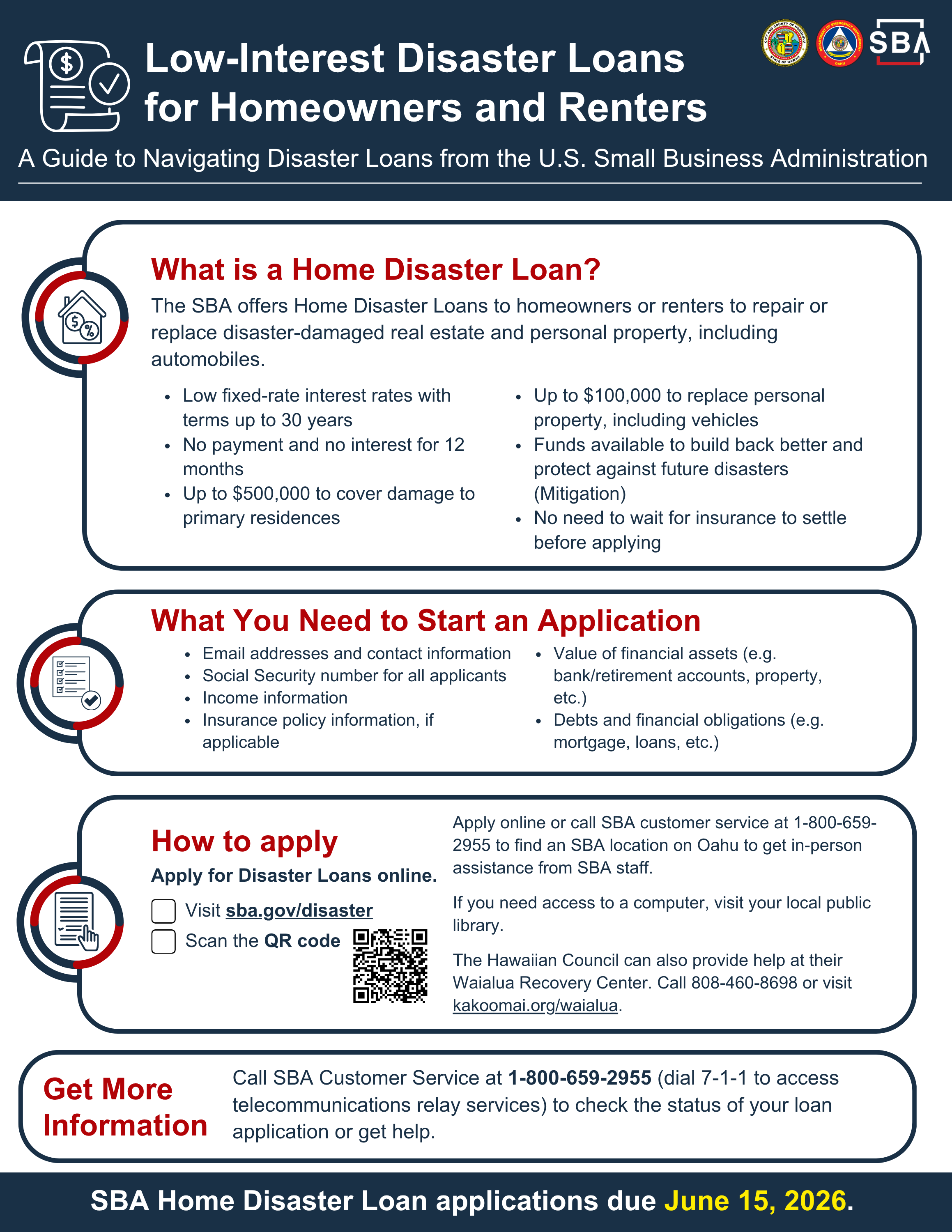 SBA offers low interest loans to homeowners, renters, and businesses affected by the disaster to support recovery and rebuilding needs. Apply at https://lending.sba.gov/search-disaster/ or call (800) 659-2955